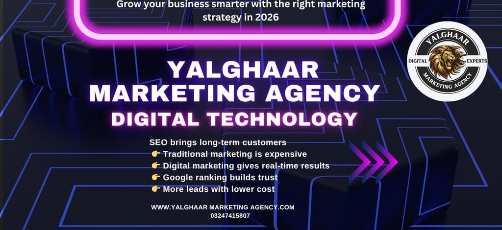 Yalghaar Marketing Agency is a full-service digital marketing company in Pakistan that provides complete solutions for businesses looking to grow online. The agency focuses on delivering measurable results through smart, data-driven strategies.